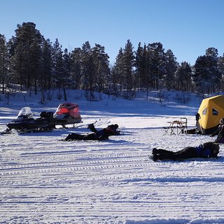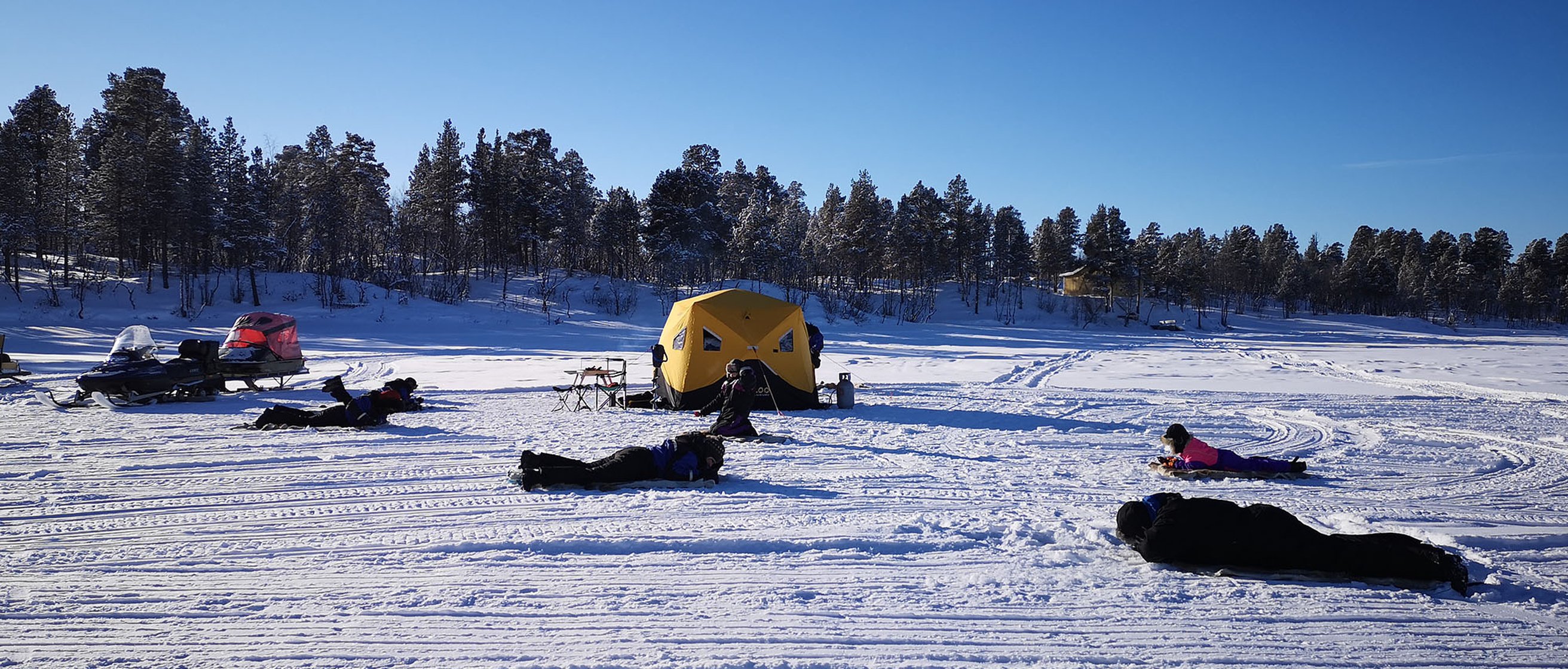 Vi lämnar civilisationen och åker längs med isälvdalen mot vildmarken och den Kaledoniska bergskedjan. Under bussfärden ser vi hur skog och myr övergår till snötäckta fjäll i en älvdal formad av inlandsisens krafter. För att komma ut på isen åker vi ut i vildmarken med en snöskoter och tillhörande kälke. På fiskeplatsen kan du sitta/ligga på renskinn och pimpla ur färdigborrade hål i isen. Under turen känner vi doften av vildmark och vinter, tänder en eld, sitter på renskinn, dricker ur träkåsor och smakar på lokala produkter.