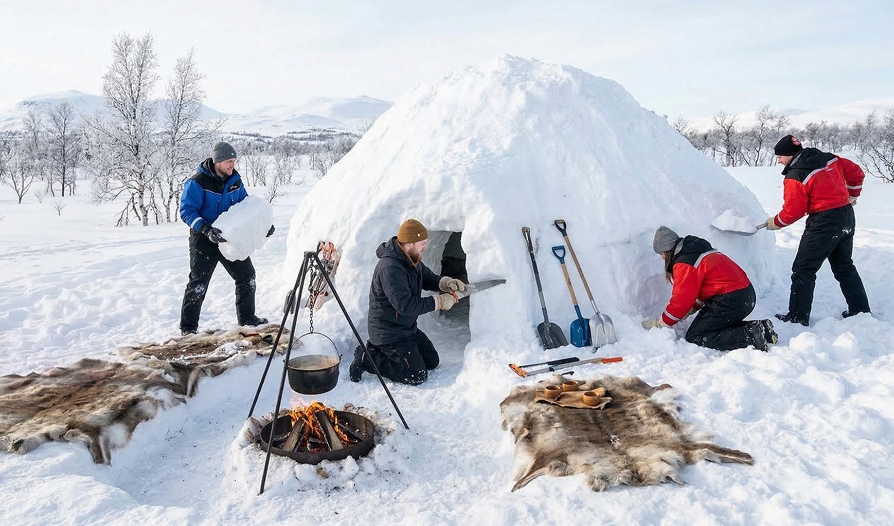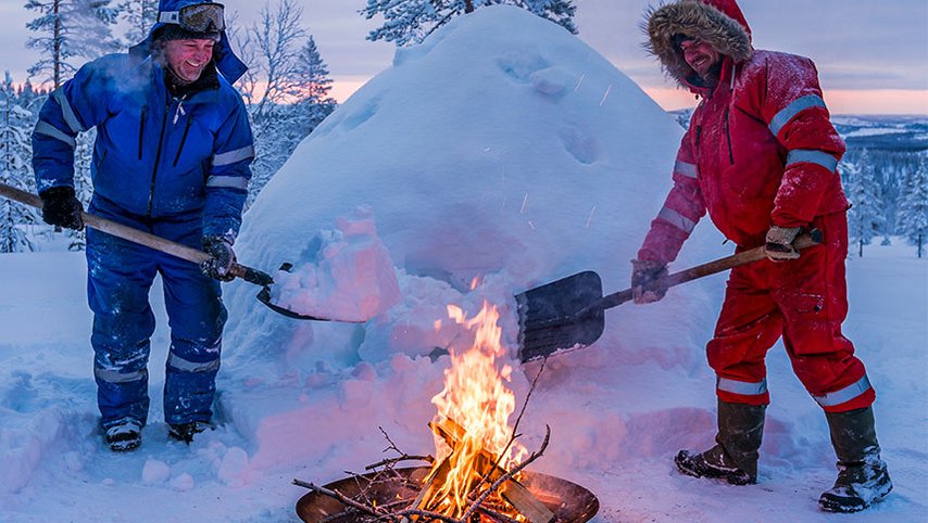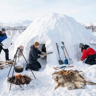 Belöningen? När du lägger sista handen vid din igloo fyller doften av vedrök luften. Vi avslutar dagen med en rejäl lunch tillagad över öppen eld.