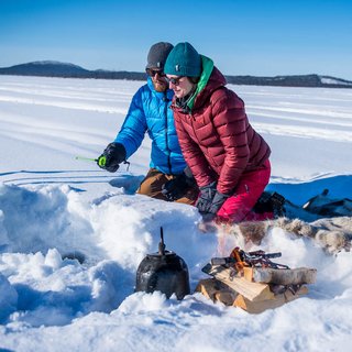You will get an overview of how ice fishing works and then you are ready to give it a try — but first you have to get through the meter-thick ice. There are also sledges for children (and adults) who may not have the patience to fish for that long. While you enjoy the ice fishing, and other winter activities, your guide will prepare lunch over the open fire. If you have managed to catch a fish it will prepared directly for you to savor.